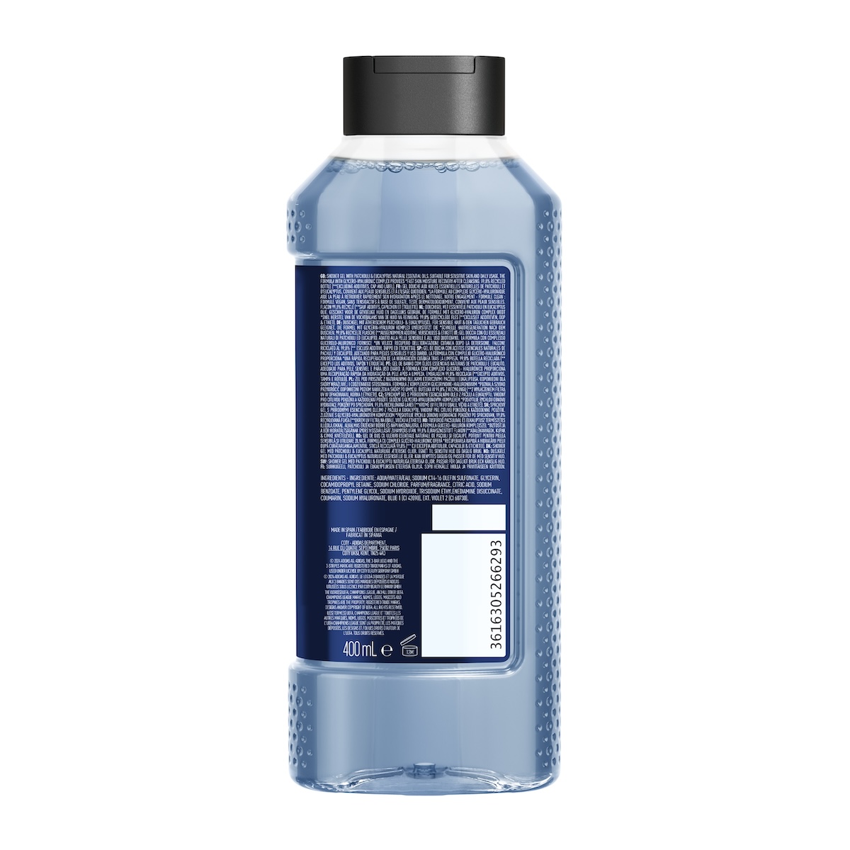 Żel pod prysznic Adidas został przetestowany dermatologicznie i jest odpowiedni do skóry wrażliwej. Butelka została wytworzona w 99,8% z materiałów pochodzących z recyklingu*.