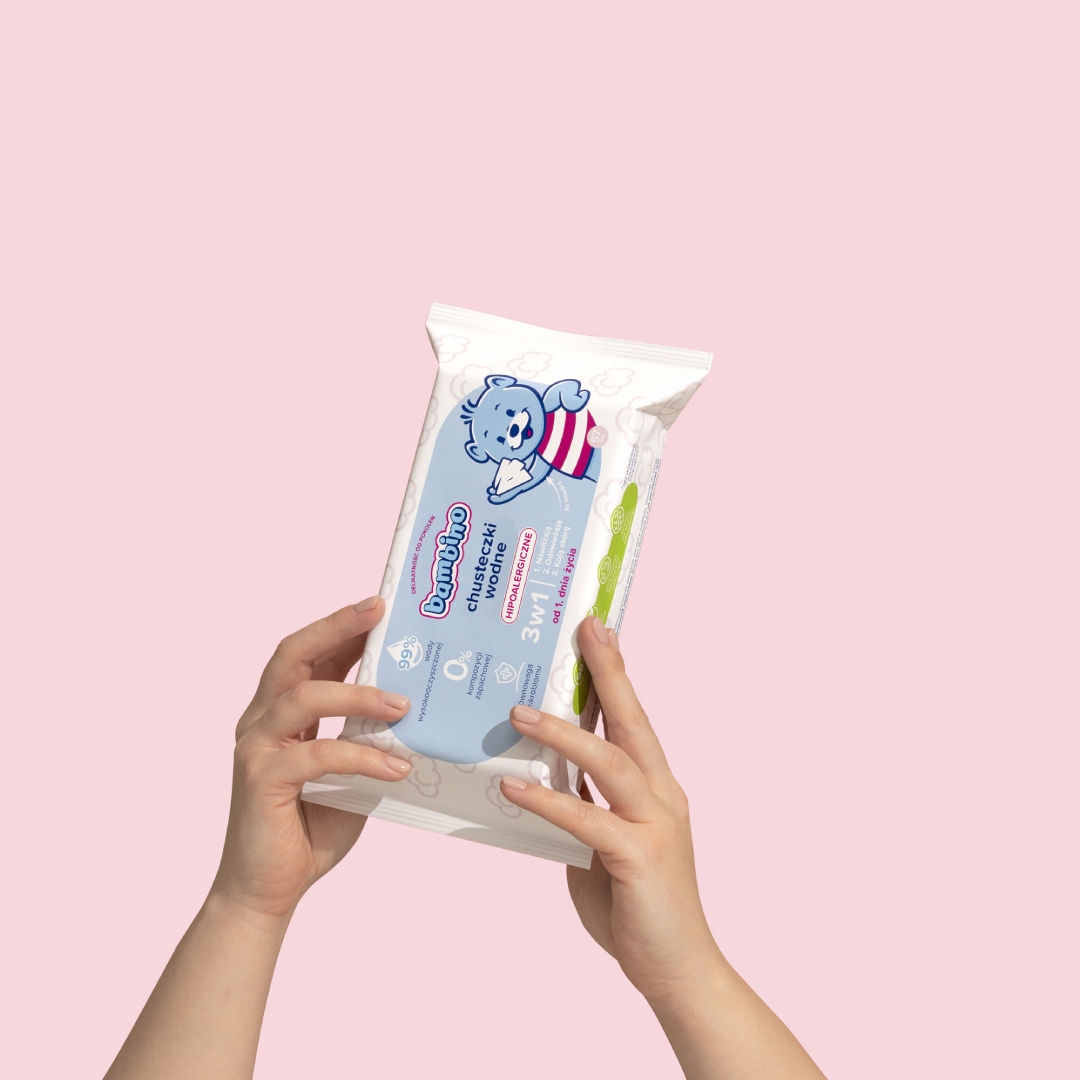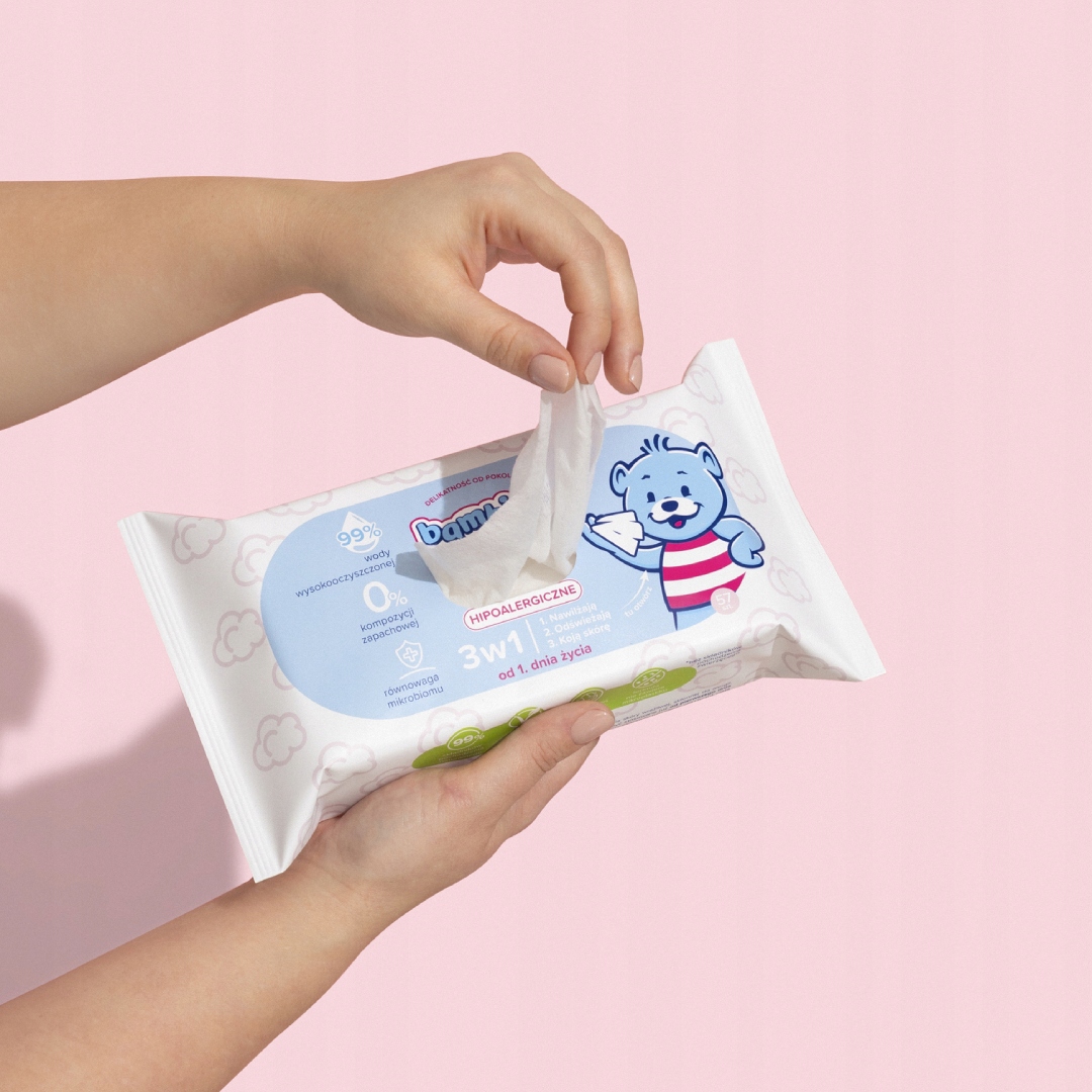 Chusteczki wodne 3w1 zawierają 99% wysokooczyszczonej wody, opracowane specjalnie z myślą o skórze wrażliwej, skłonnej do alergii, podrażnień, a także atopowej. Mogą być stosowane już od 1. dnia życia. Hipoalergiczna formuła chusteczek sprawia, że nadają się do codziennego oczyszczania twarzy, w tym okolic ust i oczu, a także ciała i rąk.