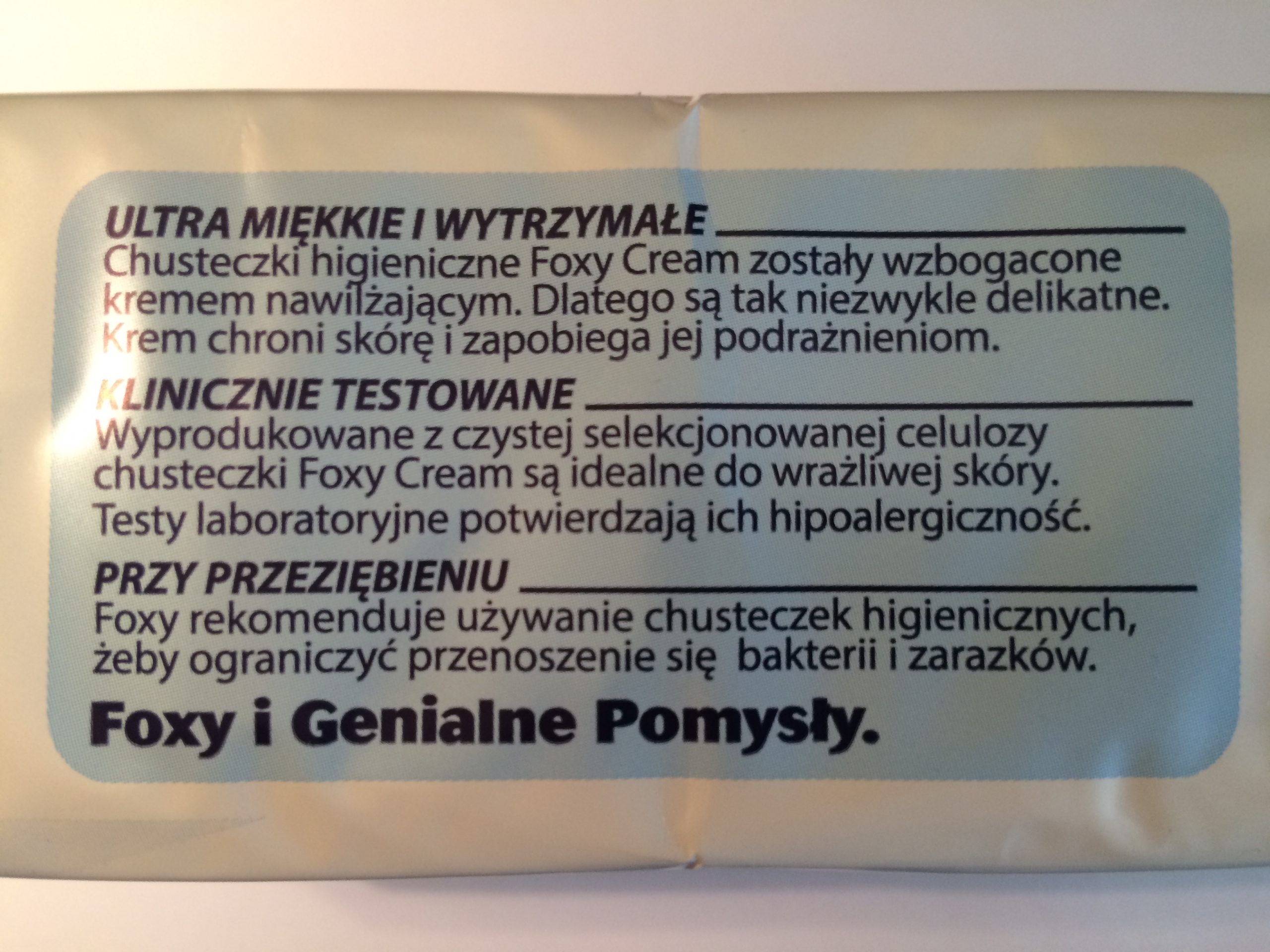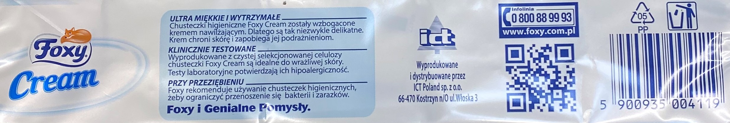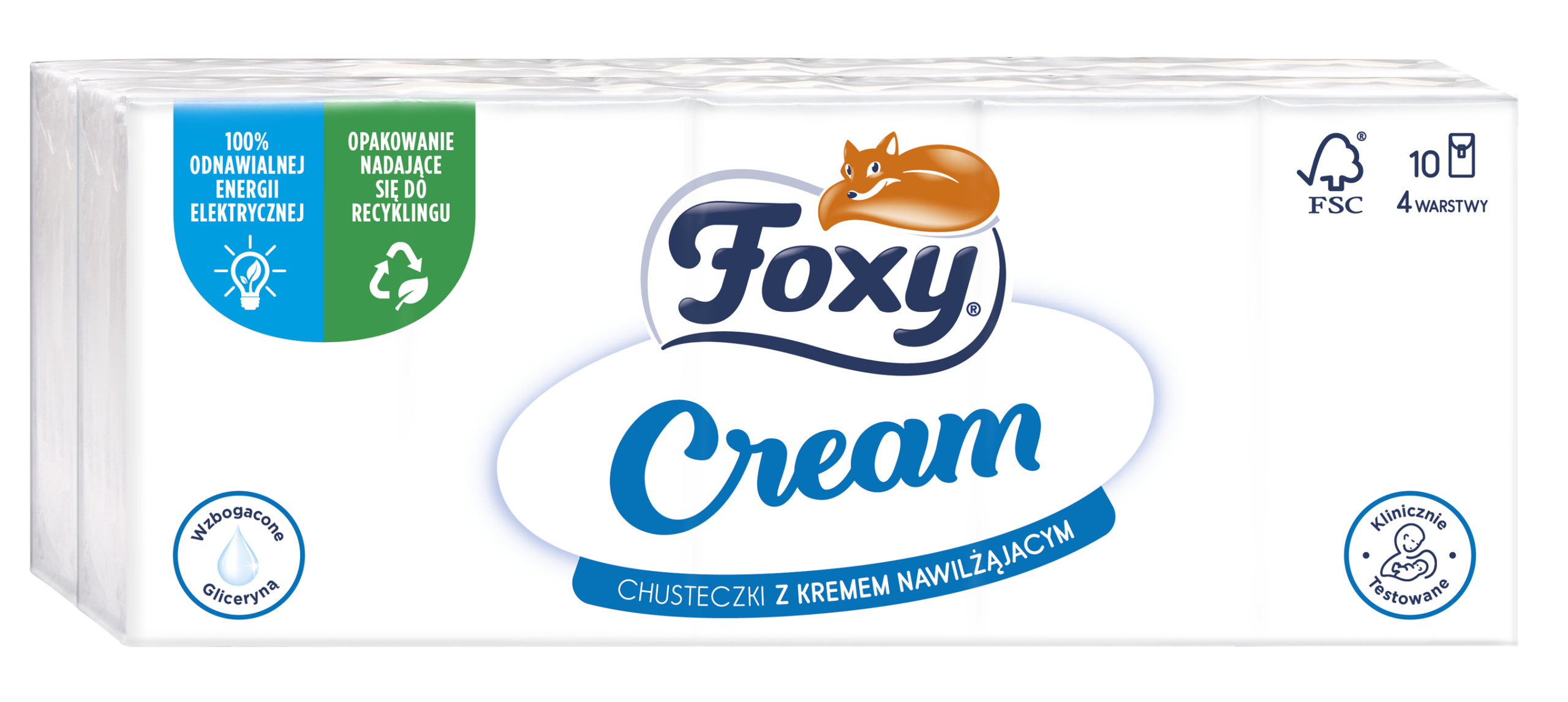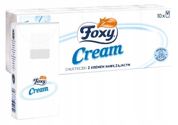 Chusteczki higieniczne Foxy Cream zostały wzbogacone kremem nawilżającym. Dlatego są tak niezwykle delikatne. Krem chroni skórę i zapobiega jej podrażnieniom.