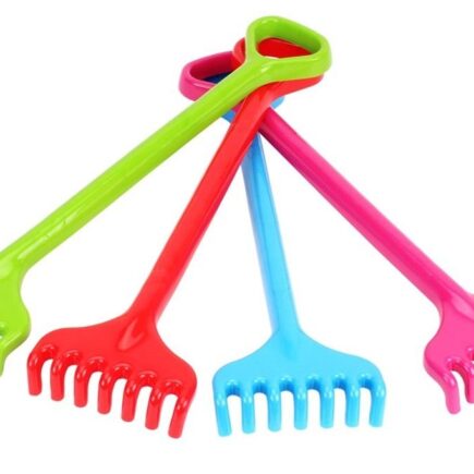 Kolorowe grabki o długości ok. 50 cm, wykonane z trwałego plastiku, bez ostrych krawędzi.