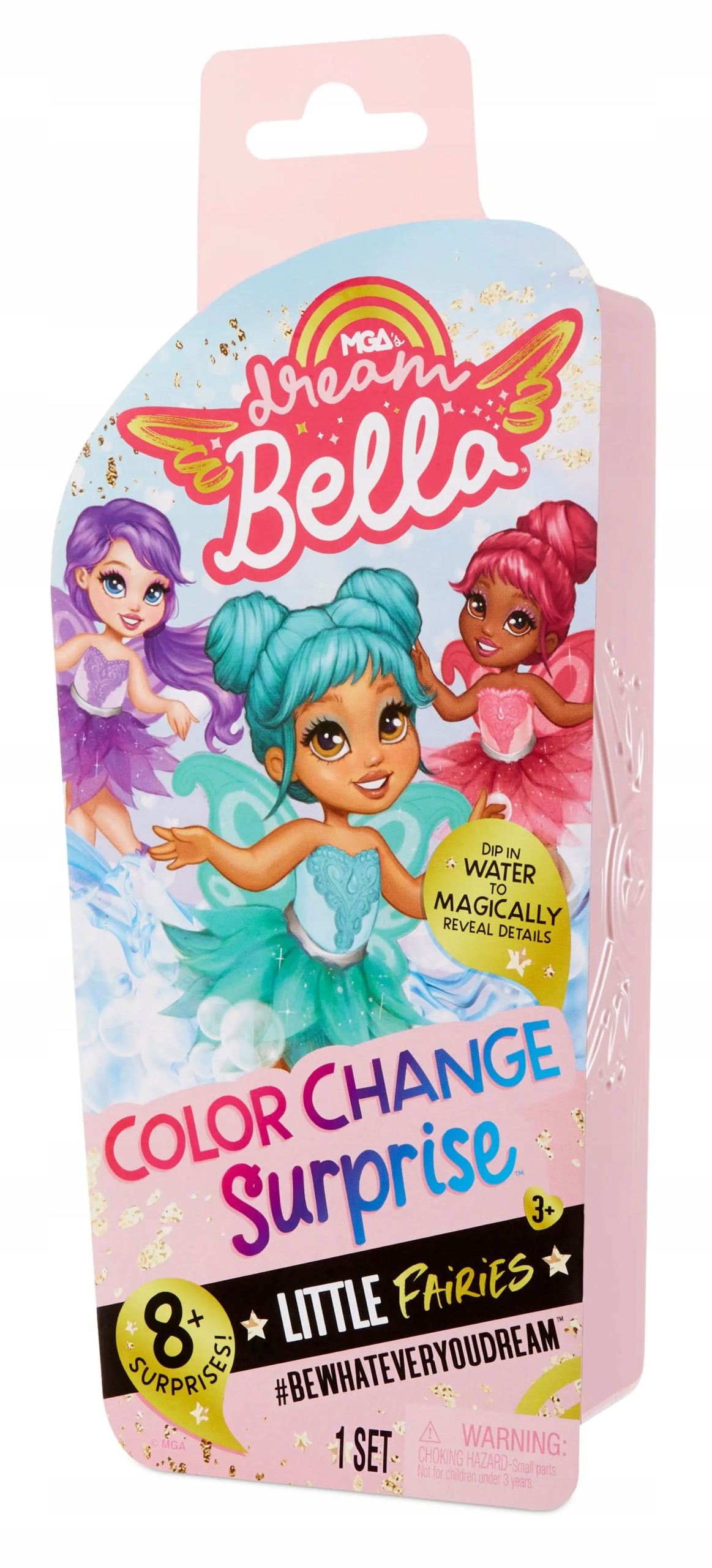 DreamBella to młodsza siostra DreamElli. Lalki Dream Bella Color Change Surprise Fairies firmy MGA zapewniają pełne niespodzianek doświadczenie podczas rozpakowywania! W każdym opakowaniu znajduje się lalka do przebierania, ale wygląd każdej z nich pozostaje tajemnicą, dopóki nie zostanie odkryty poprzez zabawę w zmianę kolorów. Następnie dziewczynki odkryją uroczą lalkę z peruką, skrzydełkami, bucikami i spódniczką.