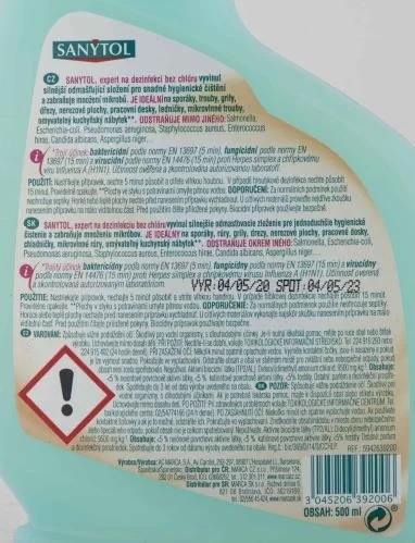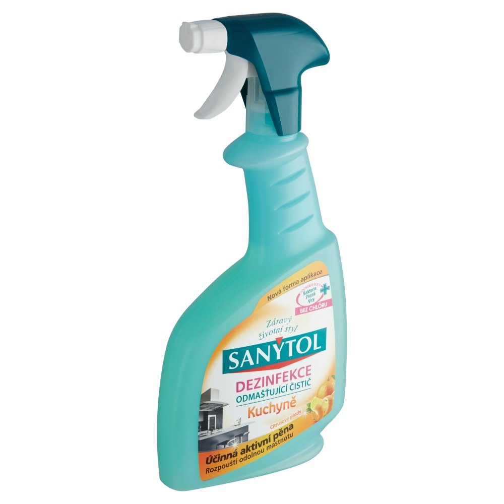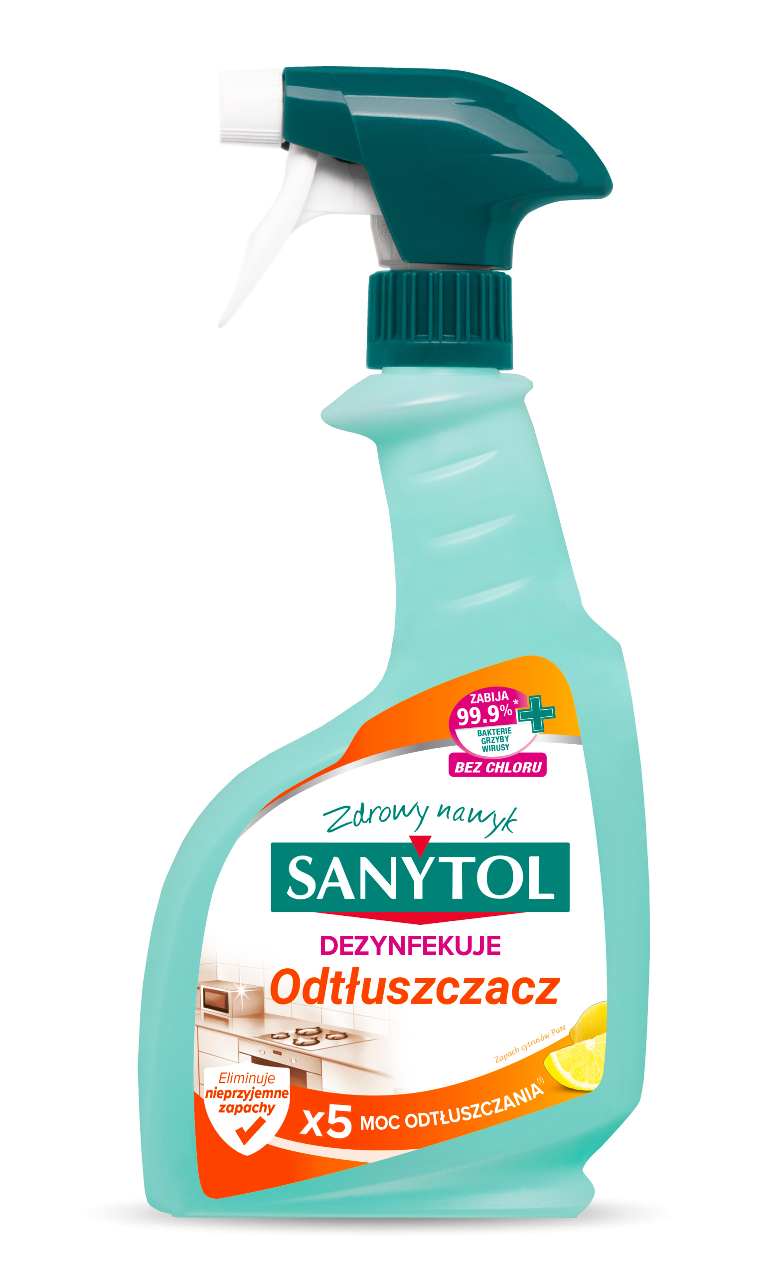 Znaczna część zatruć pokarmowych pochodzi z kuchni domowej. Stosowanie produktów dezynfekujących to jedyny sposób na skuteczne zapobieganie rozmnażaniu się mikrobów. Sanytol dezynfekuje, czyści, kuchnia, ekspert w dezynfekcji bez chloru, to preparat oparty na nowej formule. Silnie odtłuszcza, łatwo i skutecznie czyści. Aktywna piana głęboko penetruje czyszczone powierzchnie, rozpuszcza wszelkiego rodzaju tłuszcze i przywierające odpady. Sanytol gwarantuje doskonałą dezynfekcję, usuwając bakterie, wirusy i pleśń oraz dba i nadaje blask wszelkim powierzchniom. Posiada świeży zapach cytrusów. Usuwa między innymi: Pałeczka okrężnicy. Pałeczka ropy błękitnej, Gronkowiec złocisty, Enterokoki, Candida albicans, Kropidlak czarny.