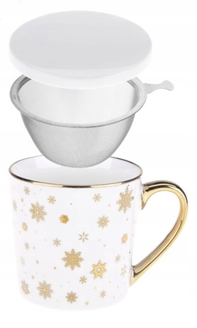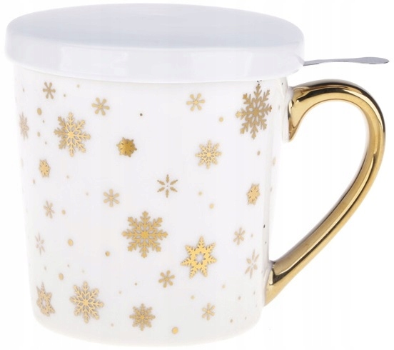 Kubek Ravi porcelana 400 ml z zaparzaczem GWIAZKI SNOWFLAKE ZŁOTY