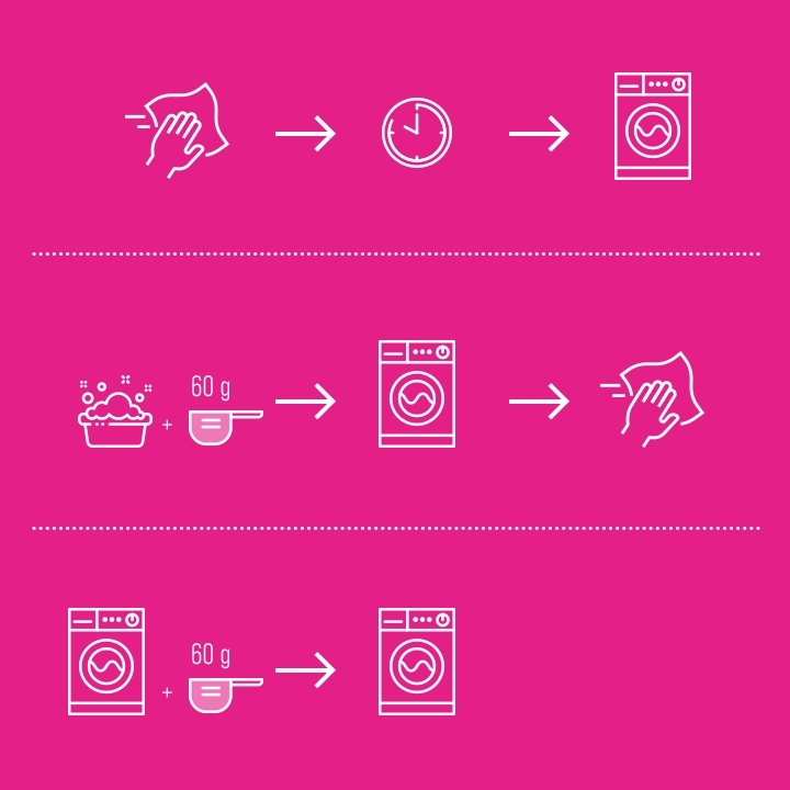 Namocz: Dodaj jedną miarkę do 4 L wody. Tkaniny białe – max 6 godz. Tkaniny kolorowe – max 1 godz. Po namoczeniu, wypierz jak zwykle lub dokładnie wypłucz. Aby uzyskać najlepsze rezultaty, należy potrzeć plamę przed wypłukaniem.