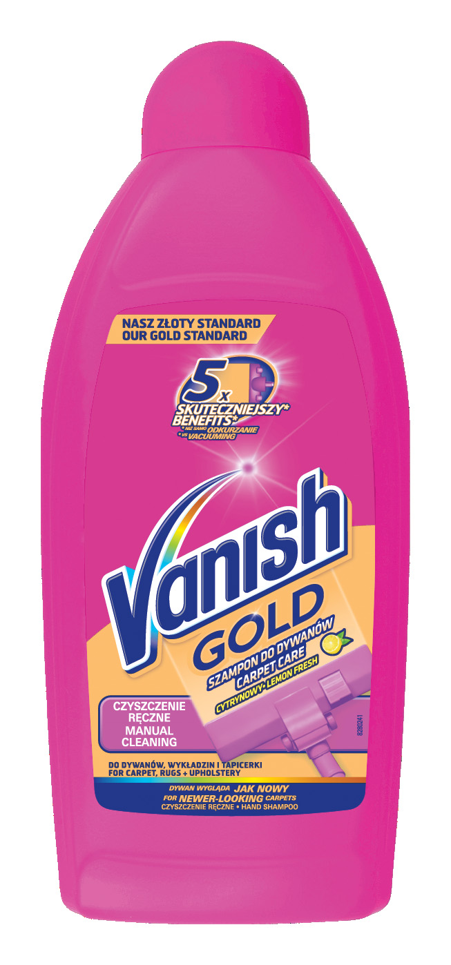 Szampon do ręcznego czyszczenia dywanów Vanish Gold o zpachu cytryn jest idealny do czyszczenia dużych powierzchni, takich jak wykładziny, dywany czy tapicerka. Skutecznie eliminuje nawet głęboko wtarty brud i trudne do usunięcia plamy. Dodatkowo neutralizuje przykre zapachy i nadaje powierzchni świeżość. Nie musisz martwić się również o sierść Twojego pupila – szampon usuwa trzy razy więcej zwierzęcej sierści niż podczas samego odkurzania.