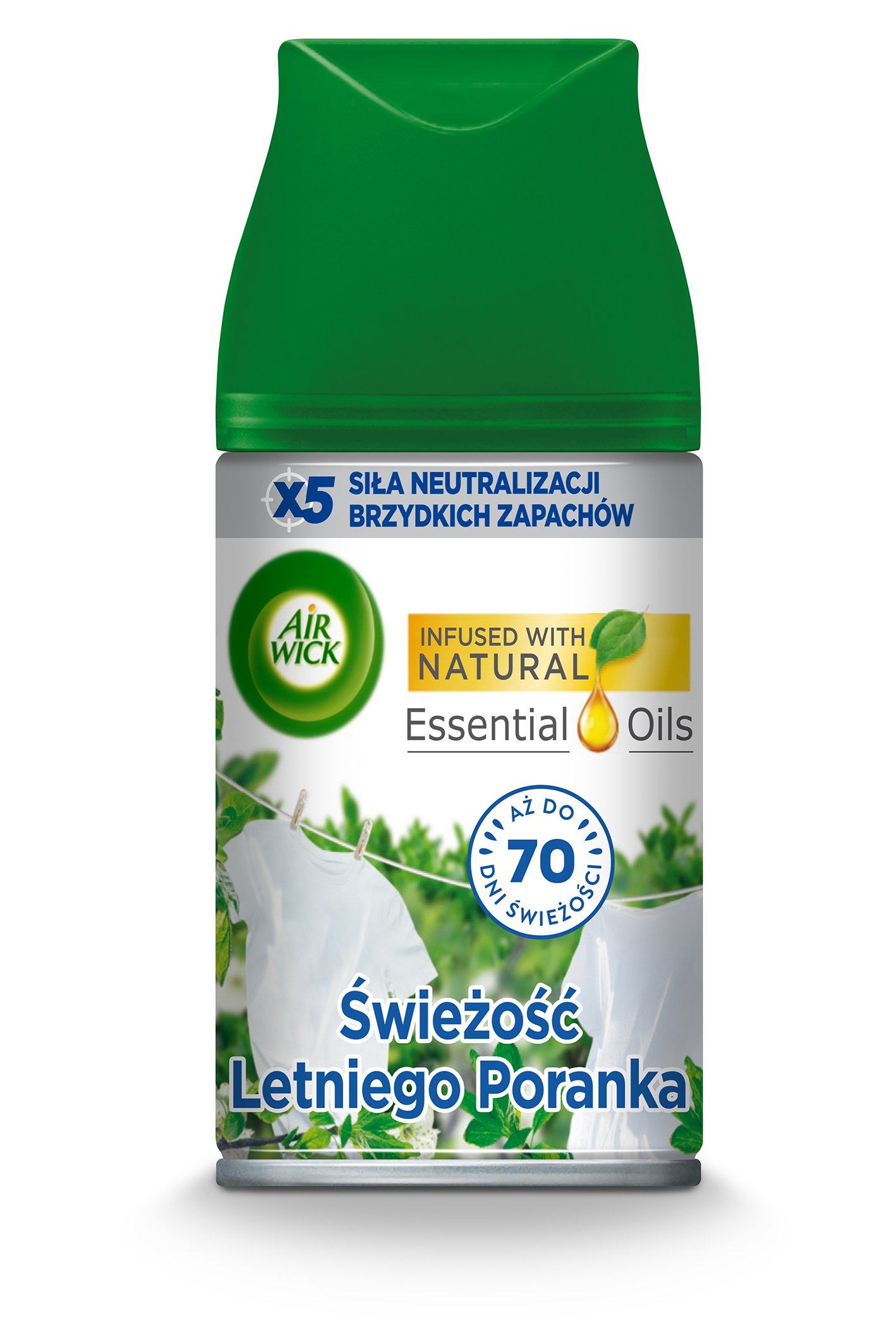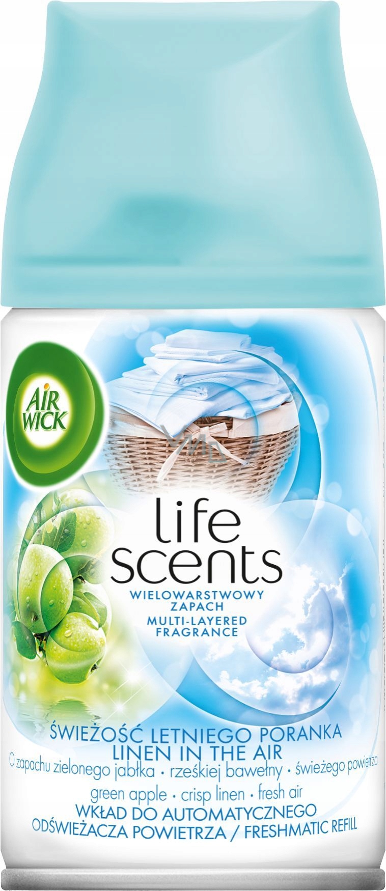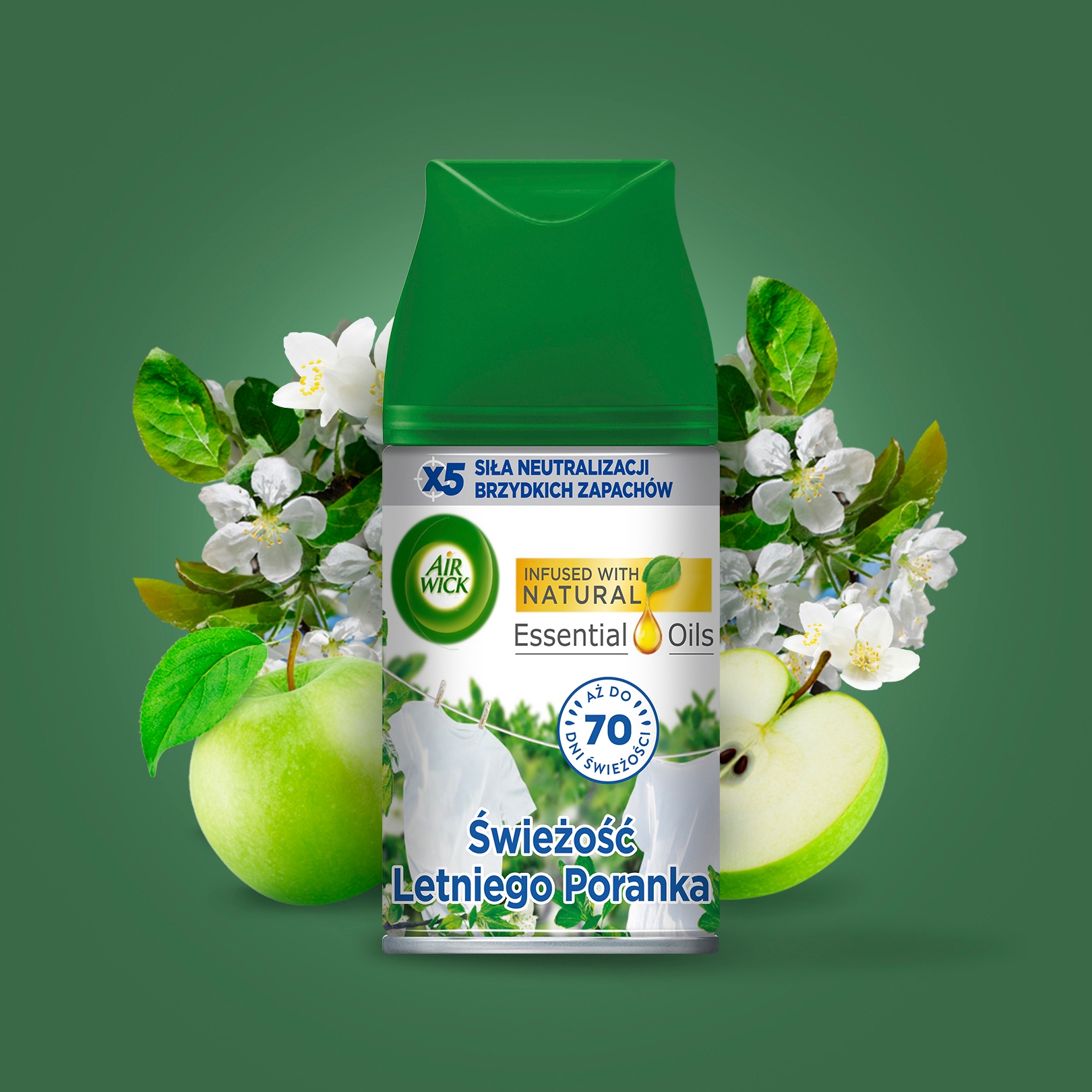 Pozbądź się nieprzyjemnych zapachów i poczuj zapach rześkiej bawełny przenikającej się z energetycznymi nutami zielonego jabłka i świeżego, letniego powietrza. Wielowarstwowy zapach przypomni Ci, dlaczego tak dobrze czujesz się w swoim domu. Wkład uwalnia nawet 2400 dawek zapachu. Wystarczy, że włożysz go do urządzenia, wybierzesz odpowiednią intensywność zapachu (jedną z trzech), ustawisz Air Wick Freshmatic w dowolnym miejscu (min. 2 metry nad ziemią) i możesz cieszyć się dyskretnym aromatem nawet przez 70 dni.*