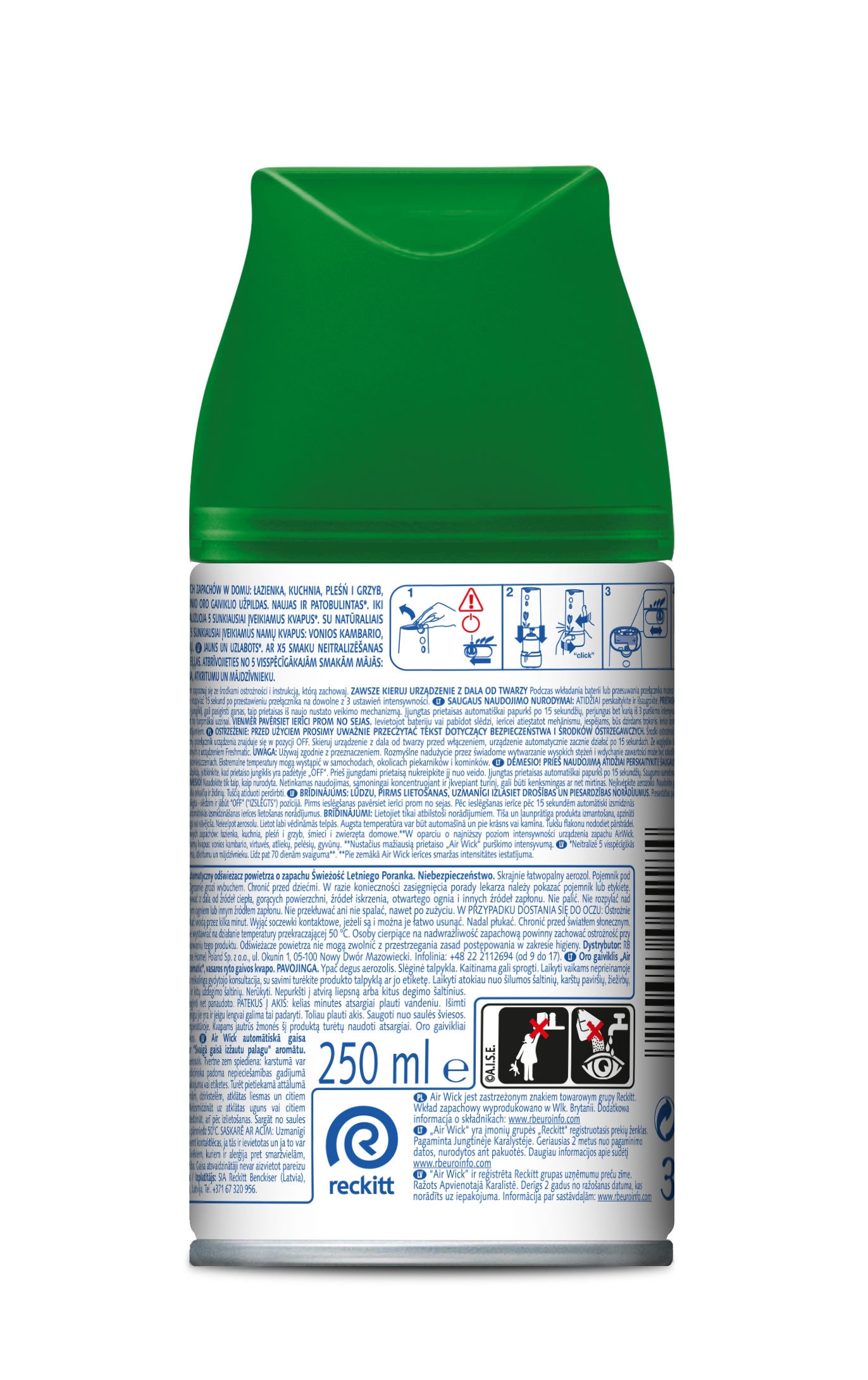 Przed użyciem zapoznaj się ze środkami ostrożności i instrukcją, którą zachowaj. Upewnij się, że urządzenie jest wyłączone (przełącznik w pozycji „OFF”) zanim przystąpisz do założenia wkładu uzupełniającego. Przy włączaniu skieruj wylot dyfuzora z dala od twarzy. Po włączeniu dyfuzor zadziała automatycznie po 15 sekundach. Ze względów bezpieczeństwa przeczytaj uważnie i stosuj instrukcję obsługi umieszczoną na puszce z aerozolem i na opakowaniu urządzenia Freshmatic. Nie kieruj urządzenia bezpośrednio na pożywienie, tkaniny lub powierzchnie. W przypadku kontaktu z powierzchnią, natychmiast przetrzyj powierzchnię wilgotną szmatką.