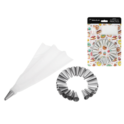 Zestaw do dekoracji ciast PRACTICO to kompletny zestaw idealny zarówno dla początkujących, jak i doświadczonych cukierników. Składa się z wygodnego, wielokrotnego użytku rękawa cukierniczego oraz 22 stalowych tylek o różnorodnych kształtach, które umożliwiają tworzenie dekoracji w wielu stylach – od subtelnych kwiatów po efektowne falbanki i wzory.